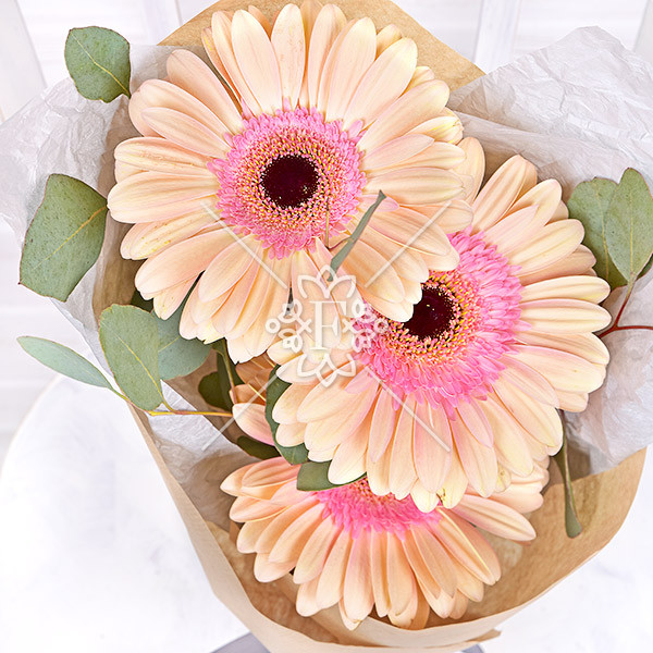 Очаровательные герберы кремово-розового оттенка с зеленью эвкалипта выглядят заманчиво, гармонично и нежно.