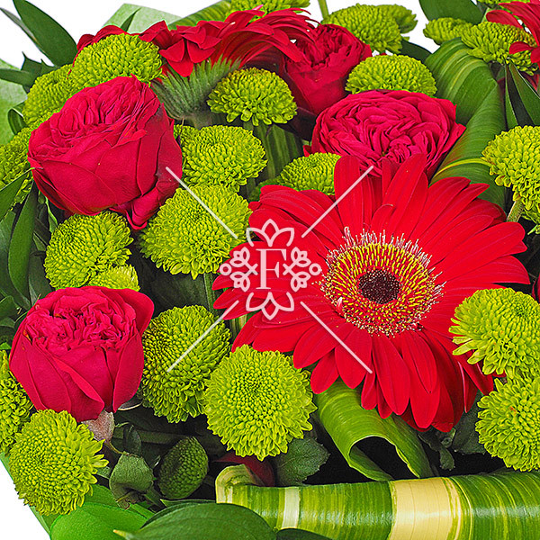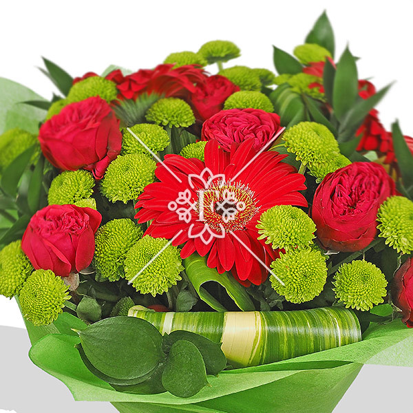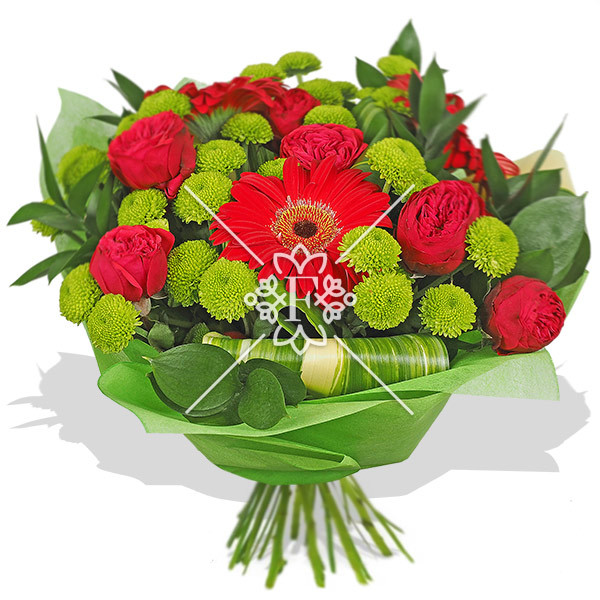 роза красная кустовая - 2 шт., гербера красная - 1 шт, хризантема кустовая зеленая - 2 шт., декоративная зелень (лист аспидистры загнутый, рускус), упаковка, зелень.